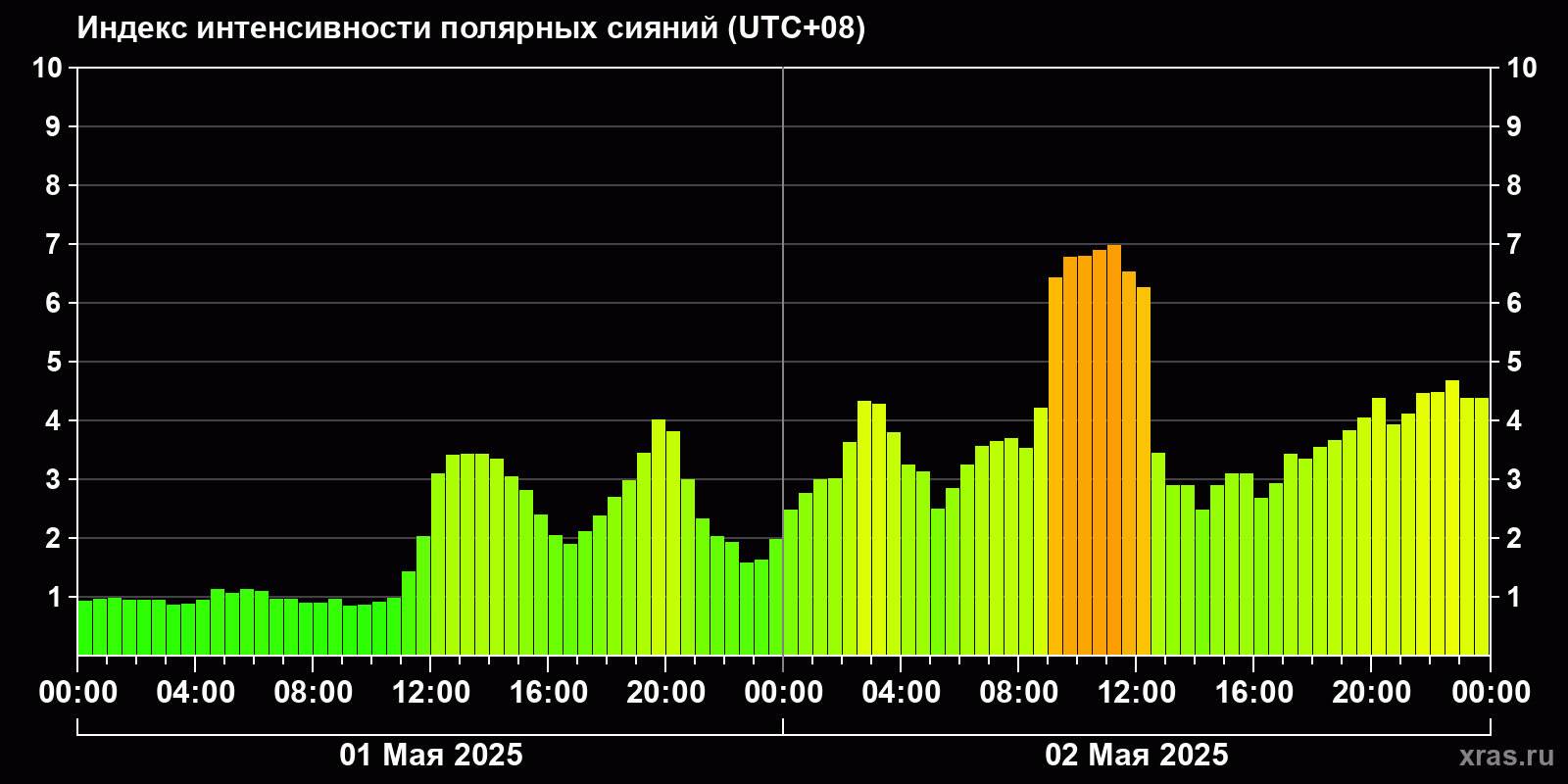Изменения индекса интенсивности полярных сияний с 2025-05-01 по 2025-05-02 по местному времени