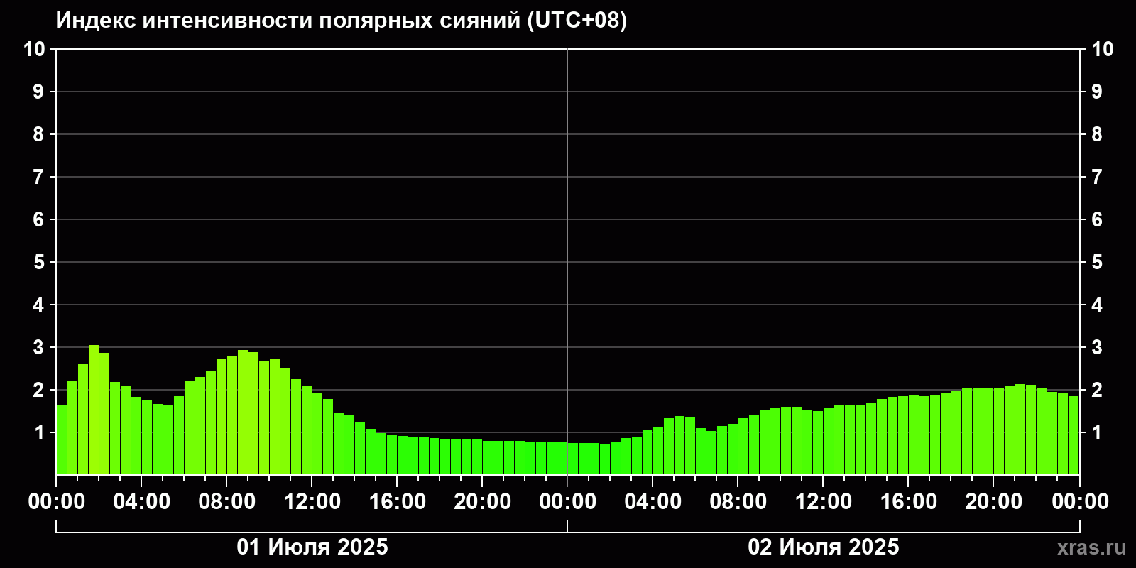 Изменения индекса интенсивности полярных сияний с 2025-07-01 по 2025-07-02 по местному времени