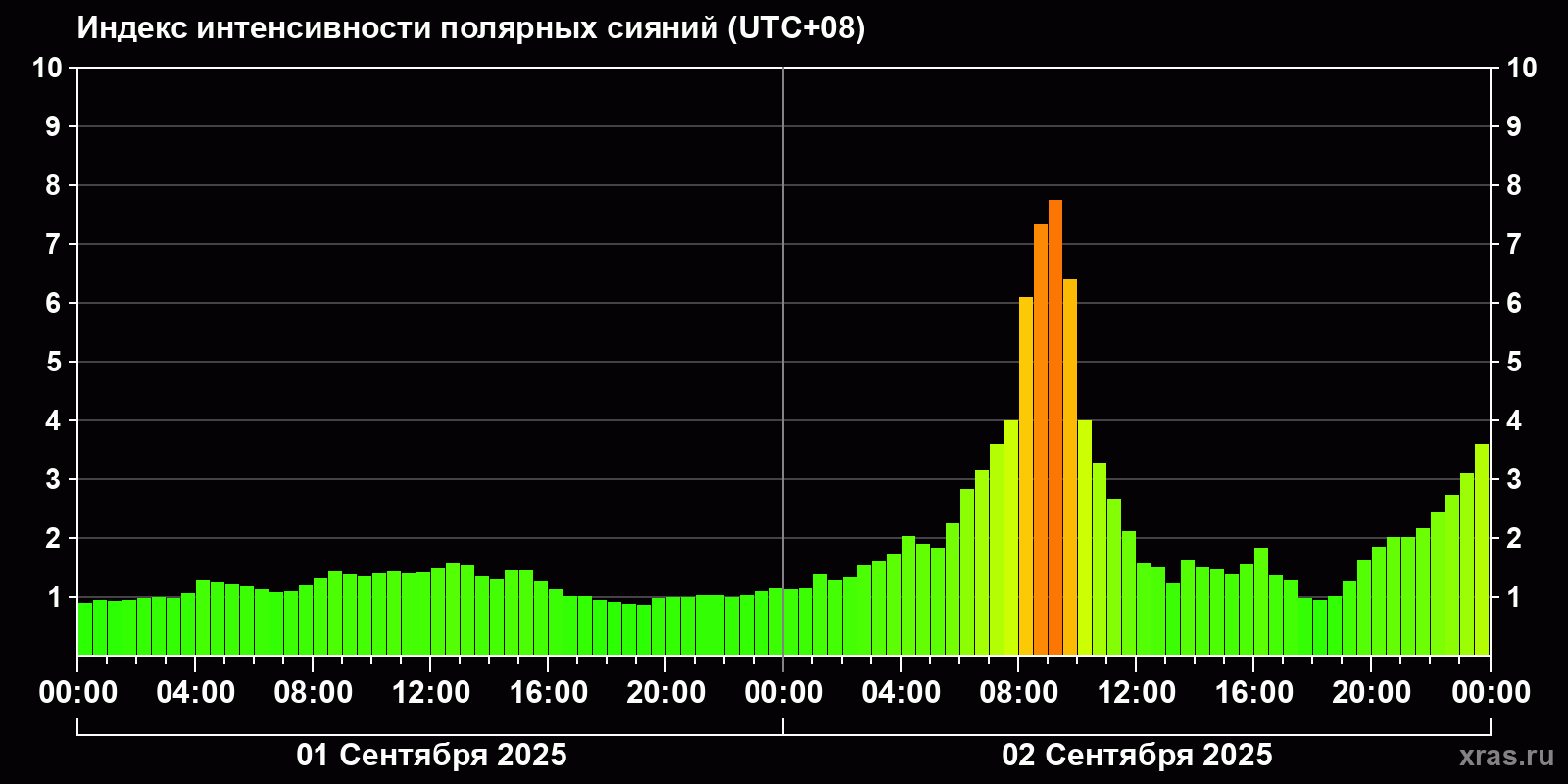 Изменения индекса интенсивности полярных сияний с 2025-09-01 по 2025-09-02 по местному времени