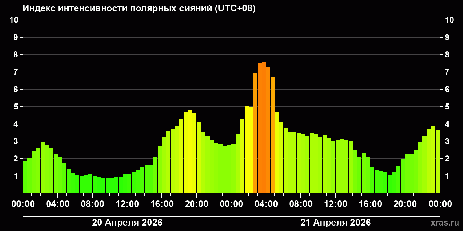 Изменения индекса интенсивности полярных сияний с 2026-04-20 по 2026-04-21 по местному времени
