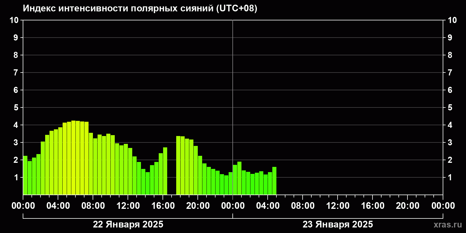 Изменения индекса интенсивности полярных сияний с 2025-01-22 по 2025-01-23 по местному времени