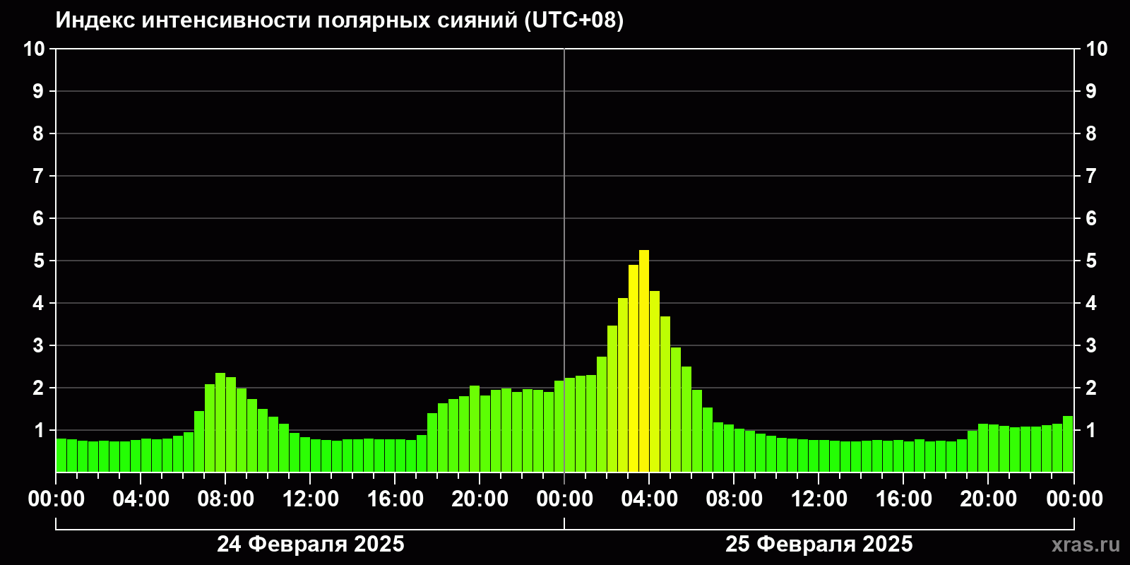 Изменения индекса интенсивности полярных сияний с 2025-02-24 по 2025-02-25 по местному времени