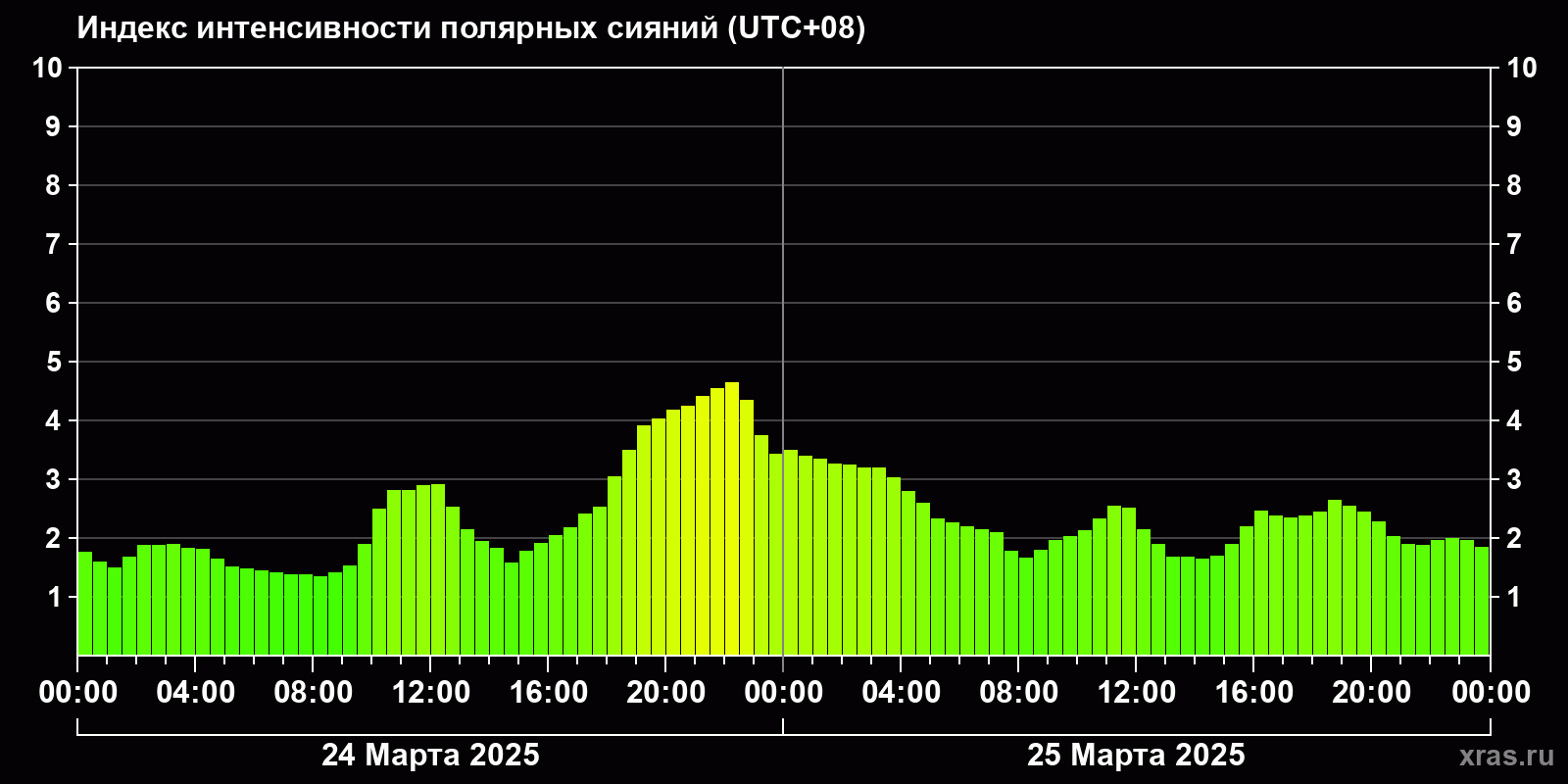 Изменения индекса интенсивности полярных сияний с 2025-03-24 по 2025-03-25 по местному времени