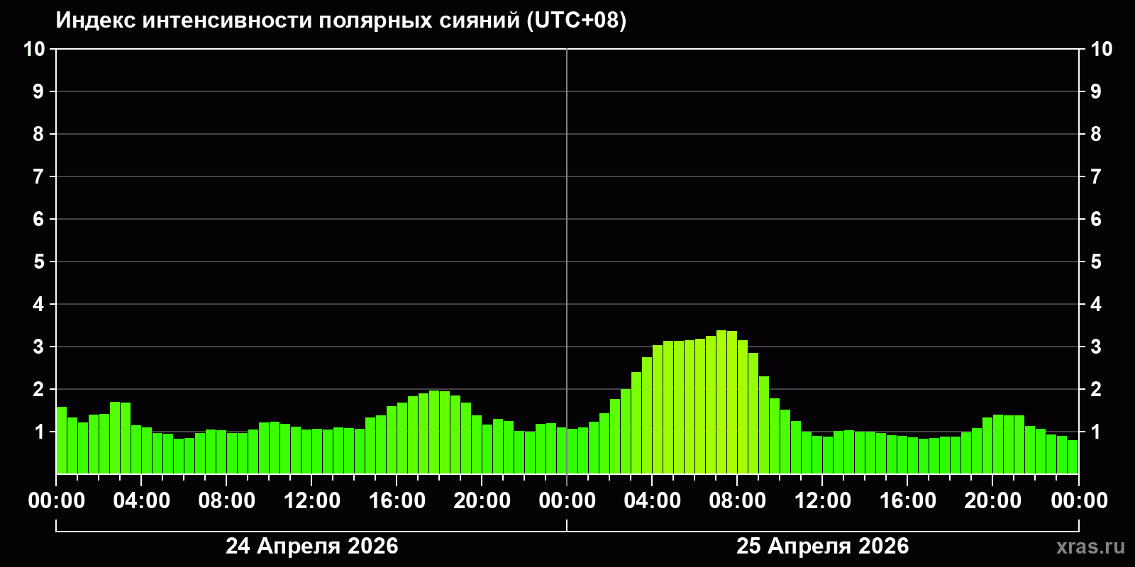 Изменения индекса интенсивности полярных сияний с 2026-04-24 по 2026-04-25 по местному времени