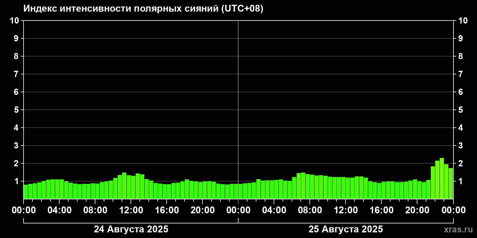 Изменения индекса интенсивности полярных сияний с 2025-08-24 по 2025-08-25 по местному времени