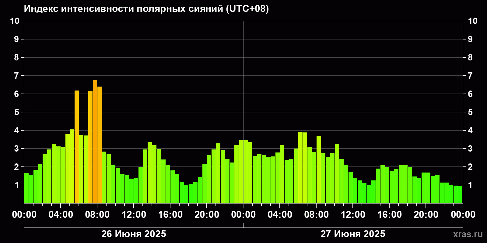 Изменения индекса интенсивности полярных сияний с 2025-06-26 по 2025-06-27 по местному времени