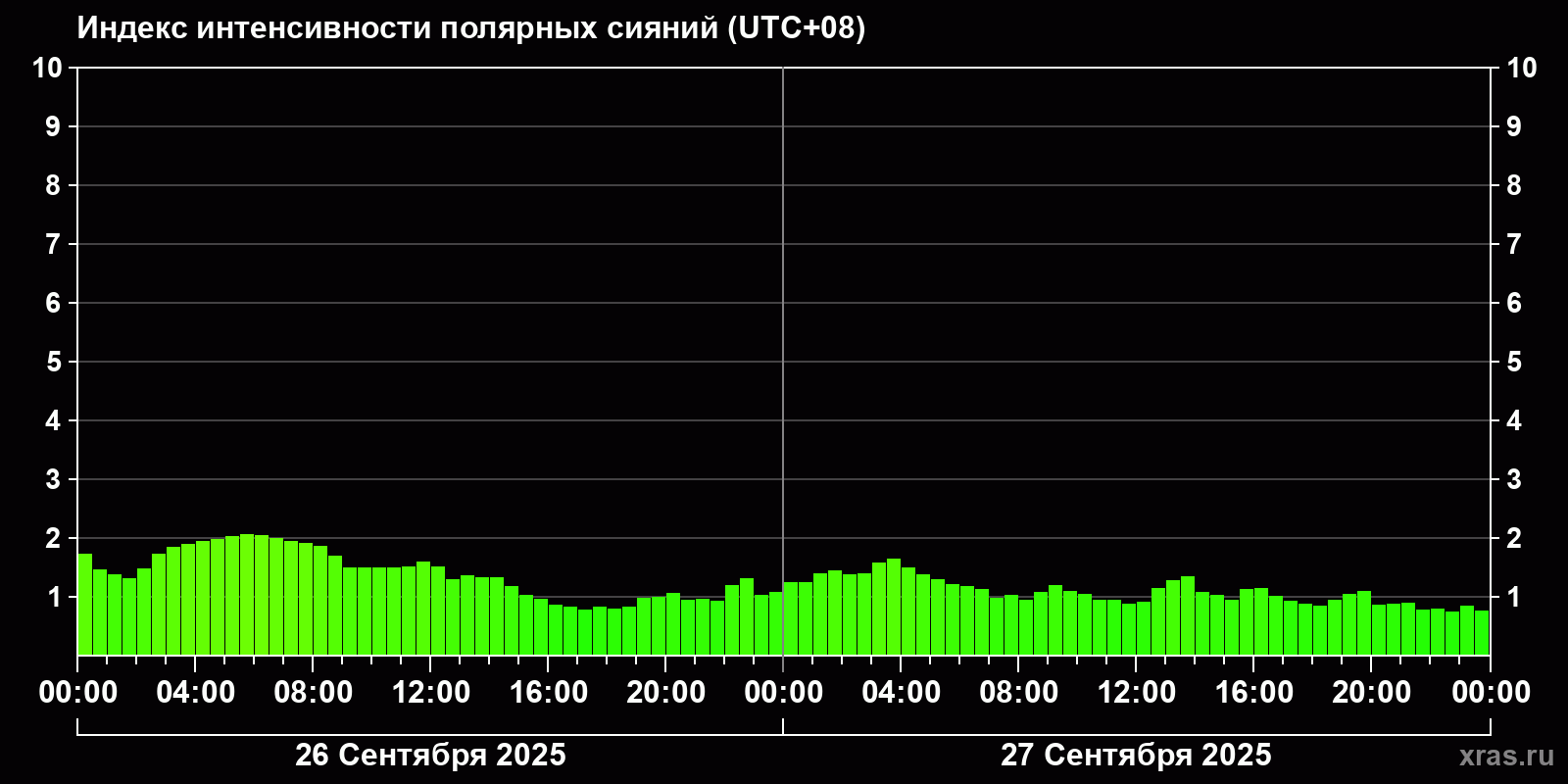 Изменения индекса интенсивности полярных сияний с 2025-09-26 по 2025-09-27 по местному времени