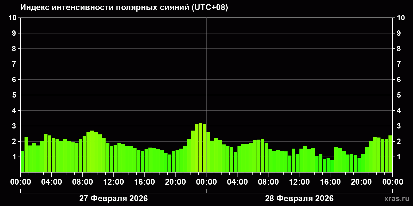 Изменения индекса интенсивности полярных сияний с 2026-02-27 по 2026-02-28 по местному времени