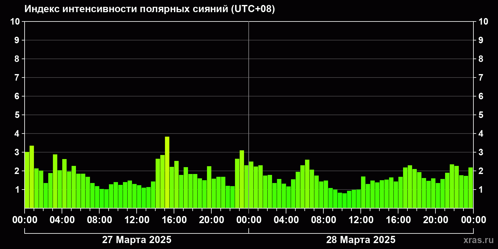 Изменения индекса интенсивности полярных сияний с 2025-03-27 по 2025-03-28 по местному времени