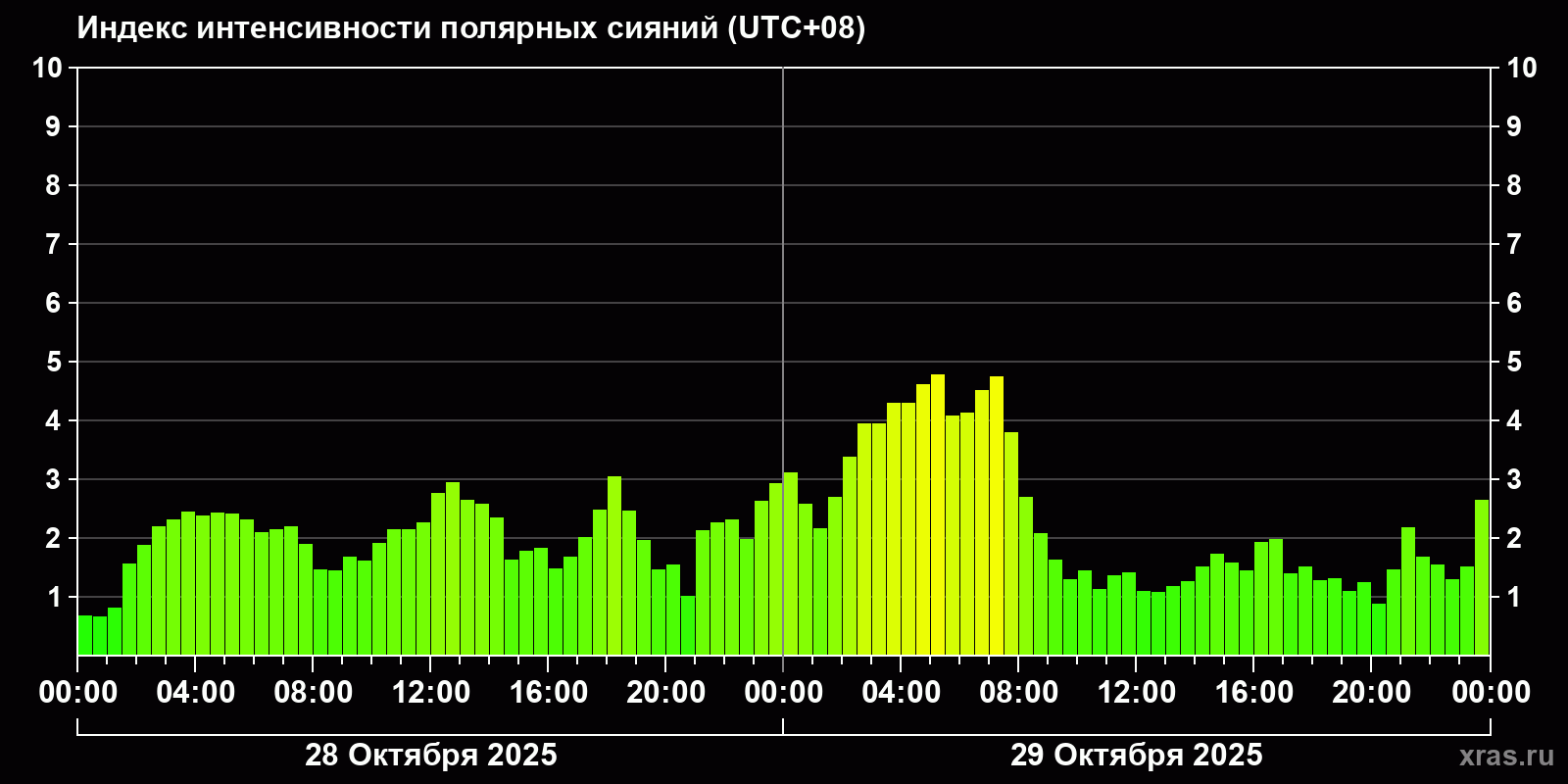 Изменения индекса интенсивности полярных сияний с 2025-10-28 по 2025-10-29 по местному времени
