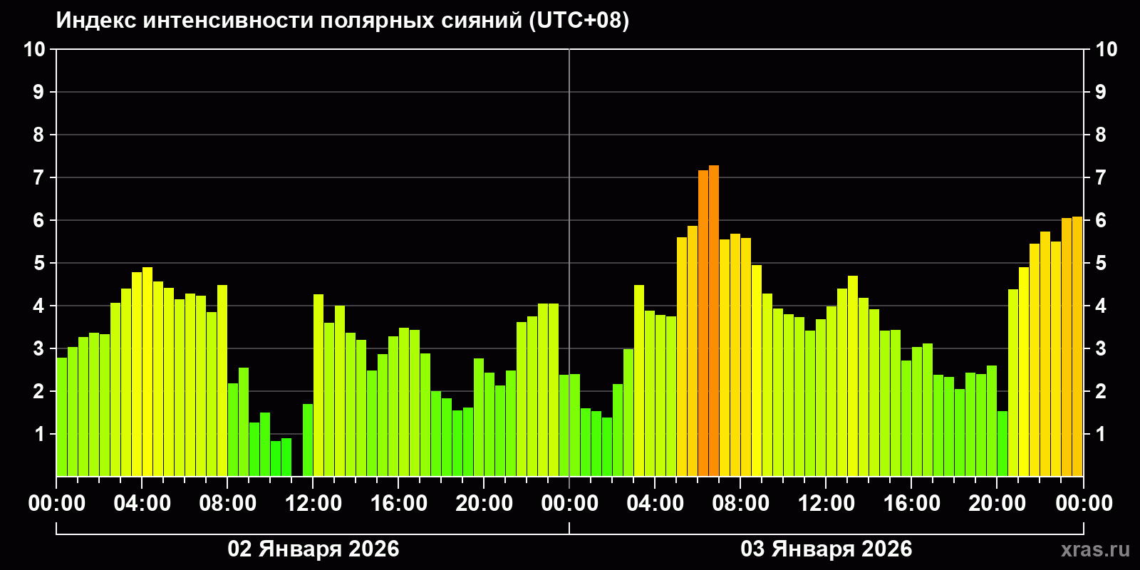 Изменения индекса интенсивности полярных сияний с 2026-01-02 по 2026-01-03 по местному времени