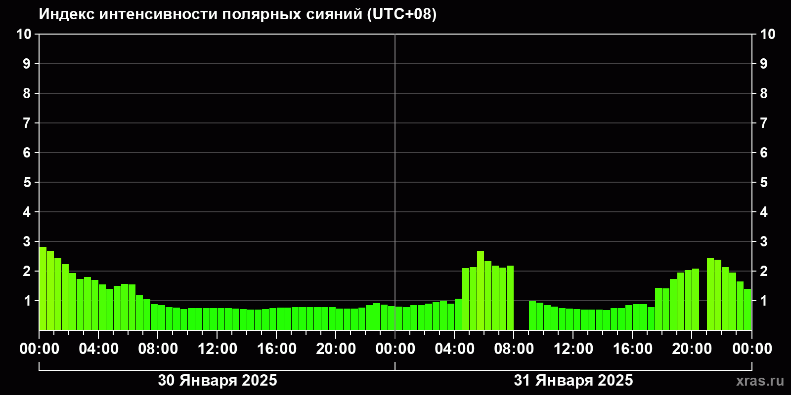 Изменения индекса интенсивности полярных сияний с 2025-01-30 по 2025-01-31 по местному времени