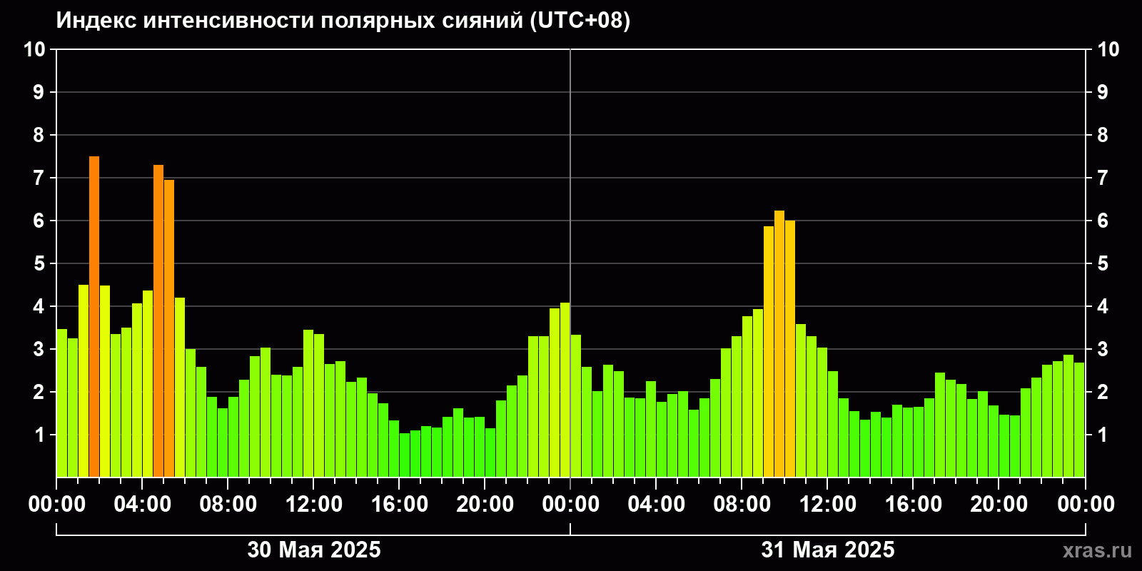 Изменения индекса интенсивности полярных сияний с 2025-05-30 по 2025-05-31 по местному времени
