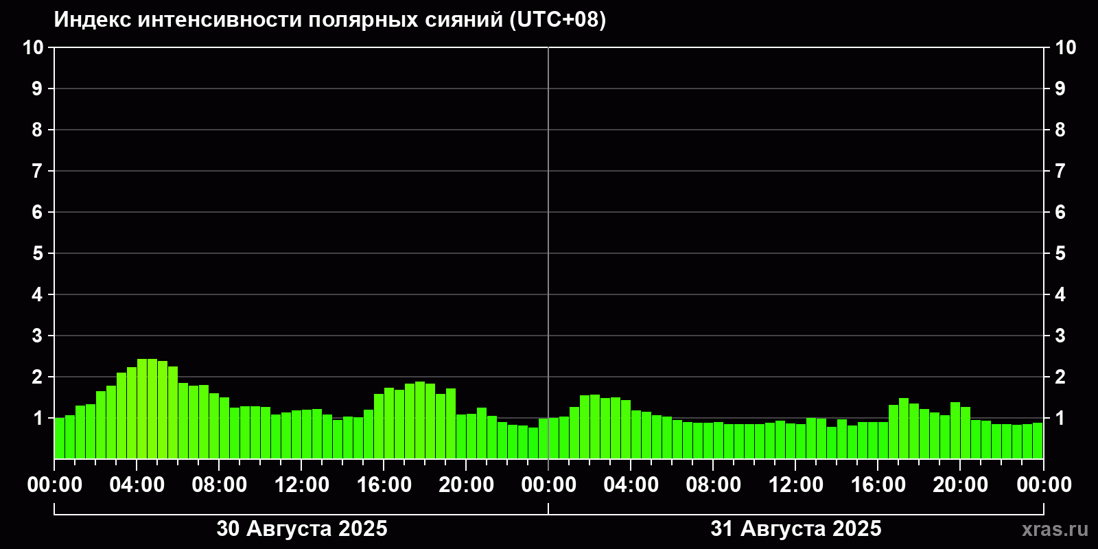 Изменения индекса интенсивности полярных сияний с 2025-08-30 по 2025-08-31 по местному времени