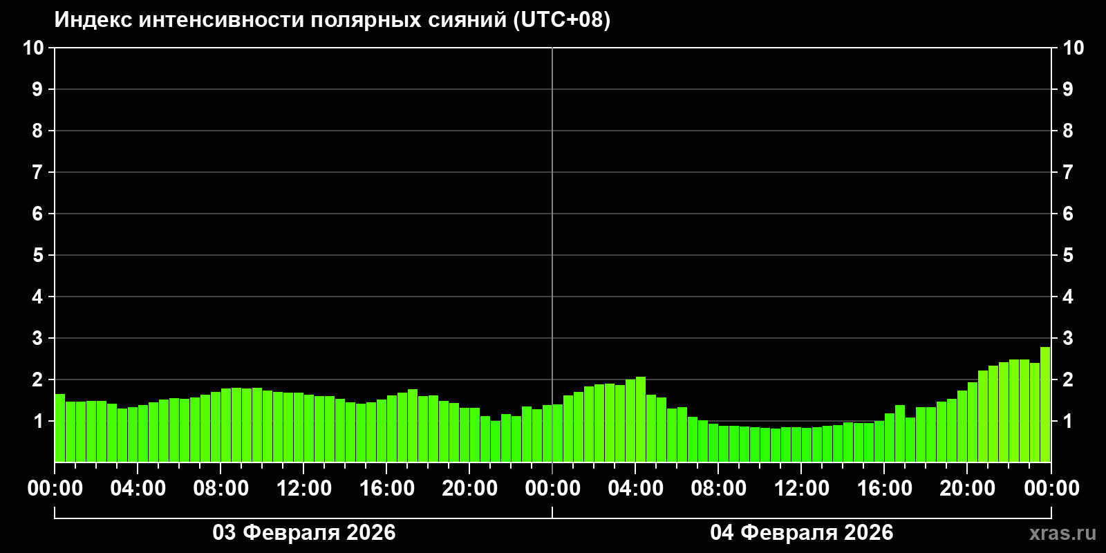 Изменения индекса интенсивности полярных сияний с 2026-02-03 по 2026-02-04 по местному времени
