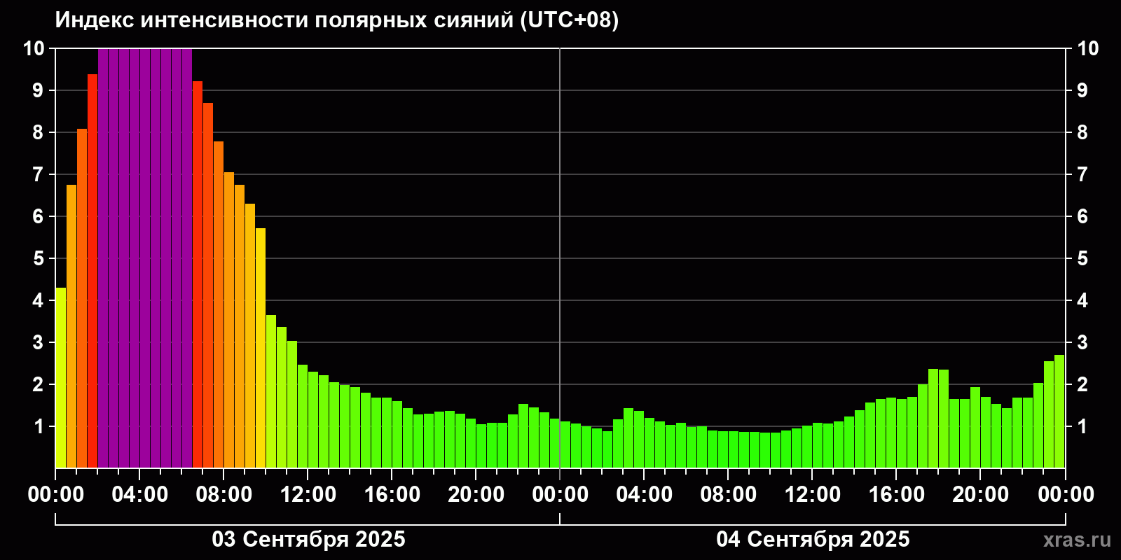Изменения индекса интенсивности полярных сияний с 2025-09-03 по 2025-09-04 по местному времени