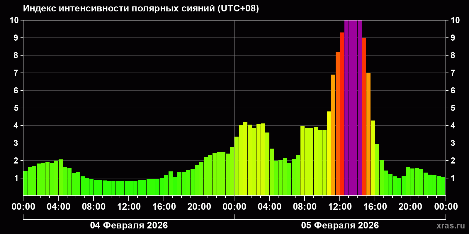 Изменения индекса интенсивности полярных сияний с 2026-02-04 по 2026-02-05 по местному времени