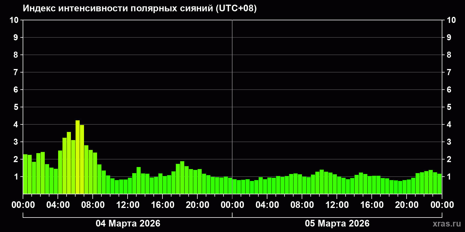 Изменения индекса интенсивности полярных сияний с 2026-03-04 по 2026-03-05 по местному времени