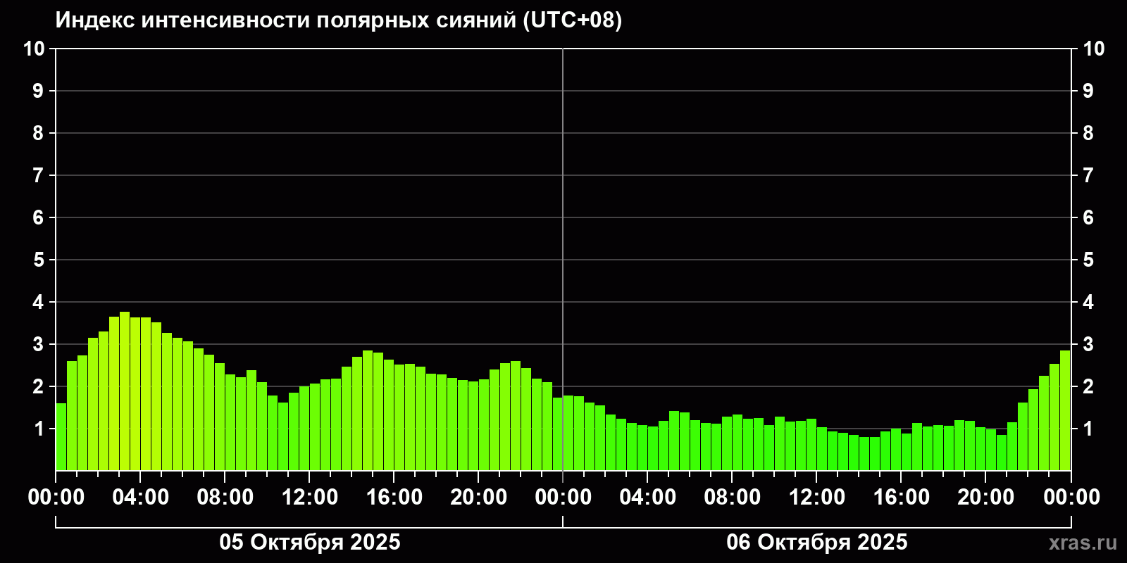 Изменения индекса интенсивности полярных сияний с 2025-10-05 по 2025-10-06 по местному времени
