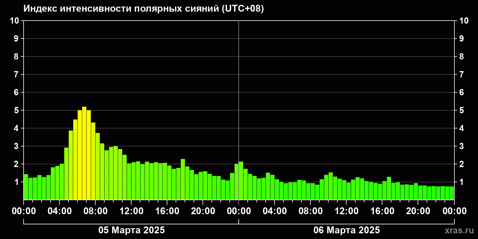 Изменения индекса интенсивности полярных сияний с 2025-03-05 по 2025-03-06 по местному времени