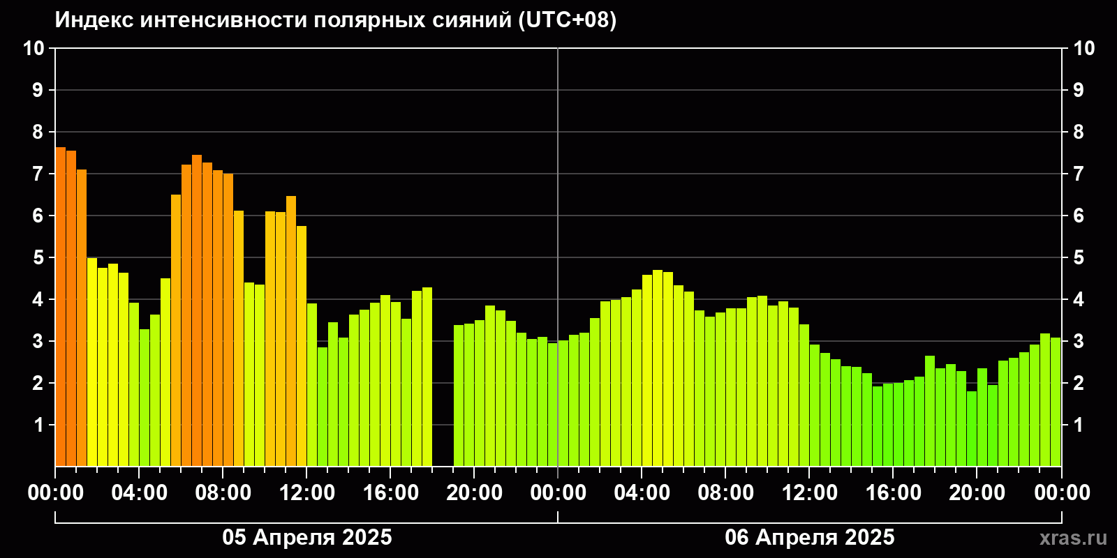 Изменения индекса интенсивности полярных сияний с 2025-04-05 по 2025-04-06 по местному времени