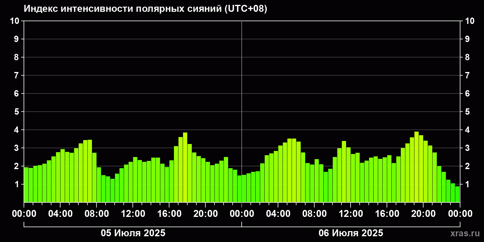 Изменения индекса интенсивности полярных сияний с 2025-07-05 по 2025-07-06 по местному времени