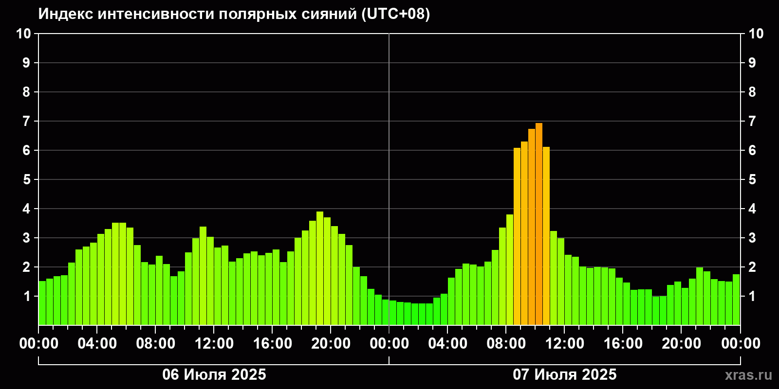 Изменения индекса интенсивности полярных сияний с 2025-07-06 по 2025-07-07 по местному времени