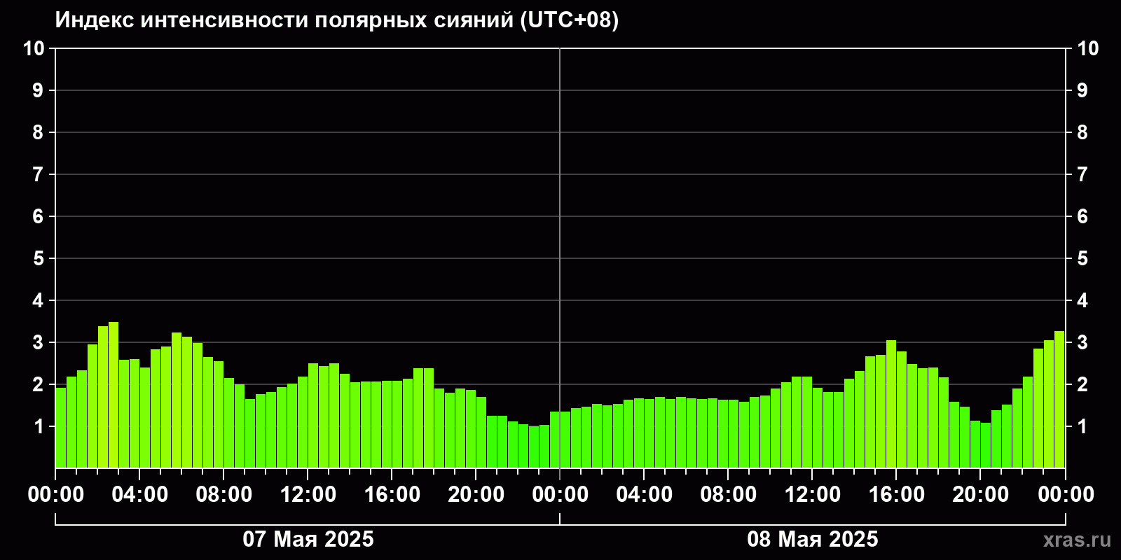 Изменения индекса интенсивности полярных сияний с 2025-05-07 по 2025-05-08 по местному времени