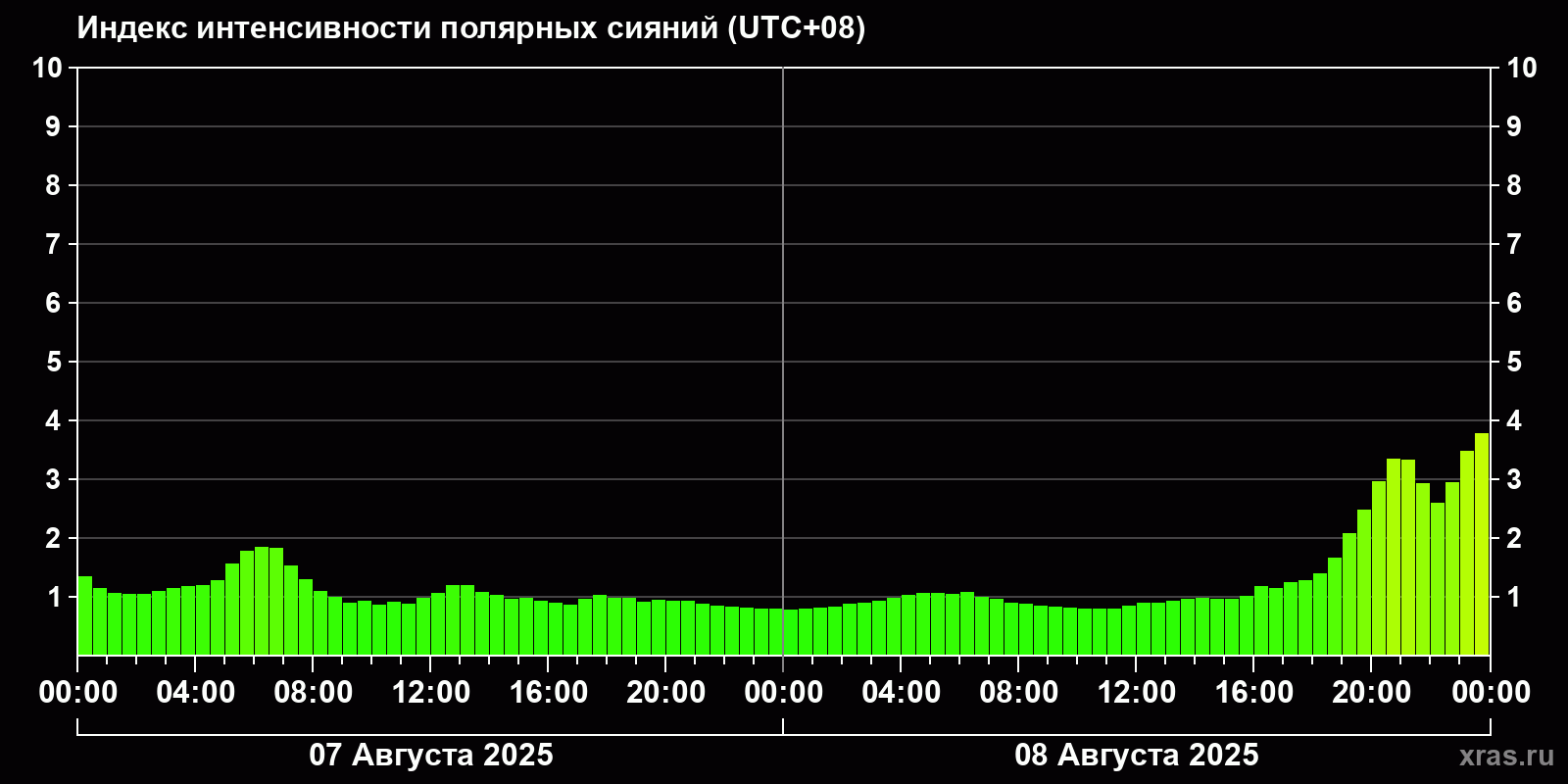 Изменения индекса интенсивности полярных сияний с 2025-08-07 по 2025-08-08 по местному времени