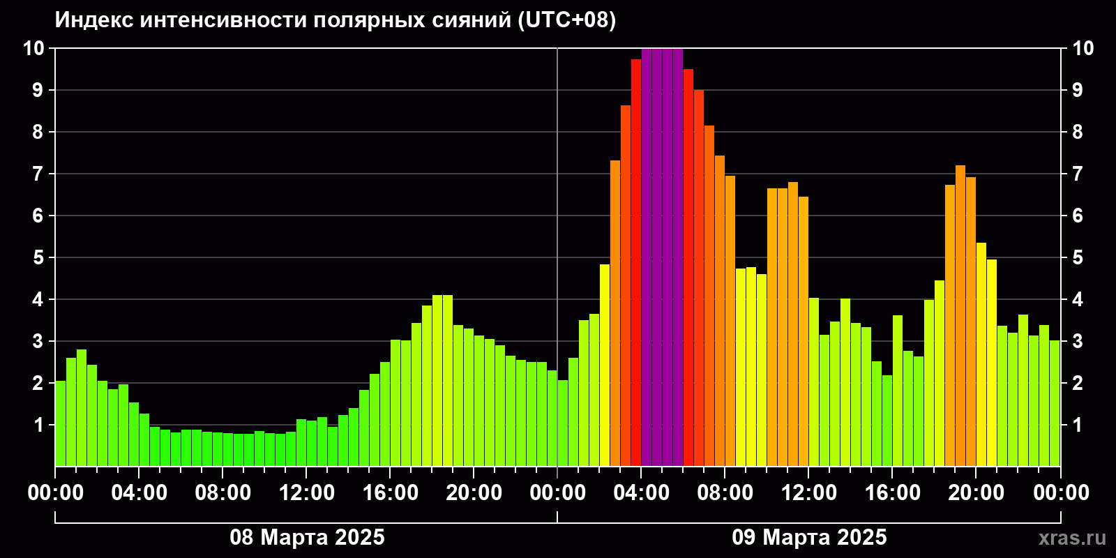 Изменения индекса интенсивности полярных сияний с 2025-03-08 по 2025-03-09 по местному времени