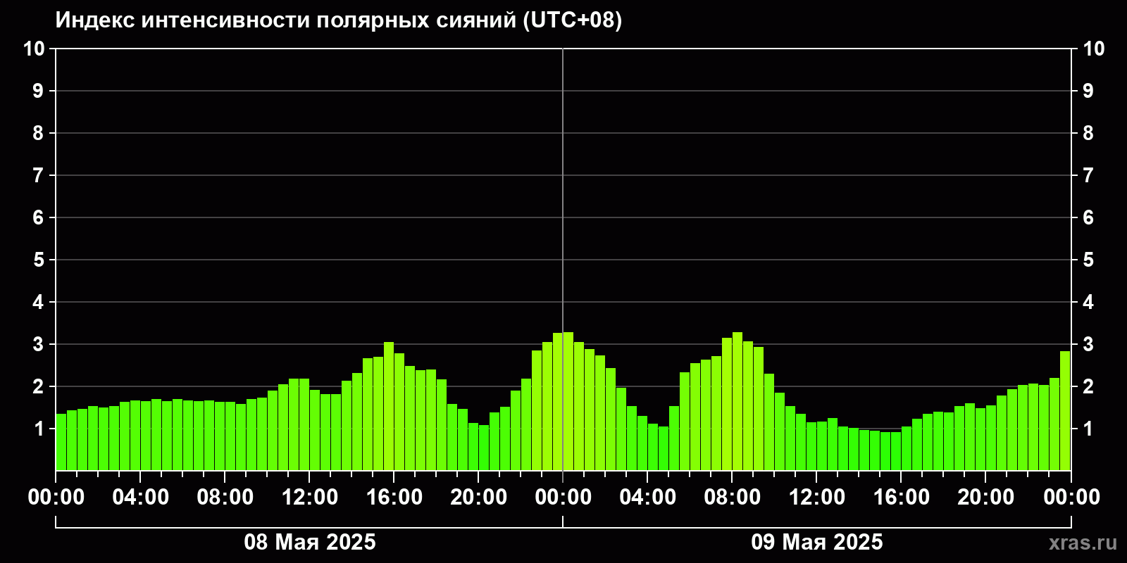 Изменения индекса интенсивности полярных сияний с 2025-05-08 по 2025-05-09 по местному времени