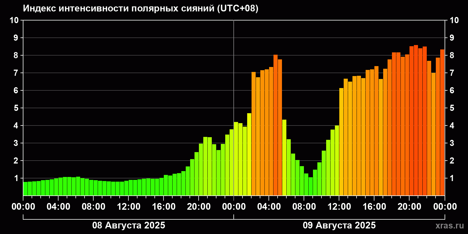 Изменения индекса интенсивности полярных сияний с 2025-08-08 по 2025-08-09 по местному времени