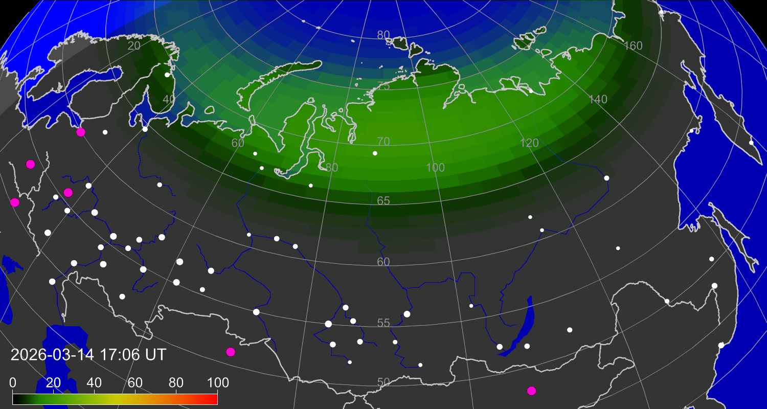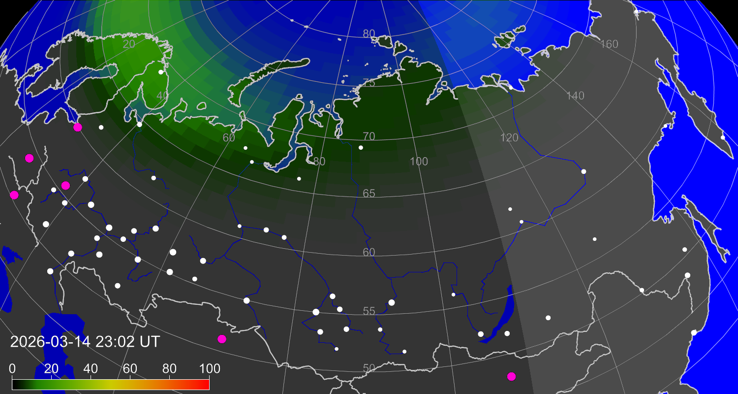 Вероятность полярных сияний в городах Российской Федерации
