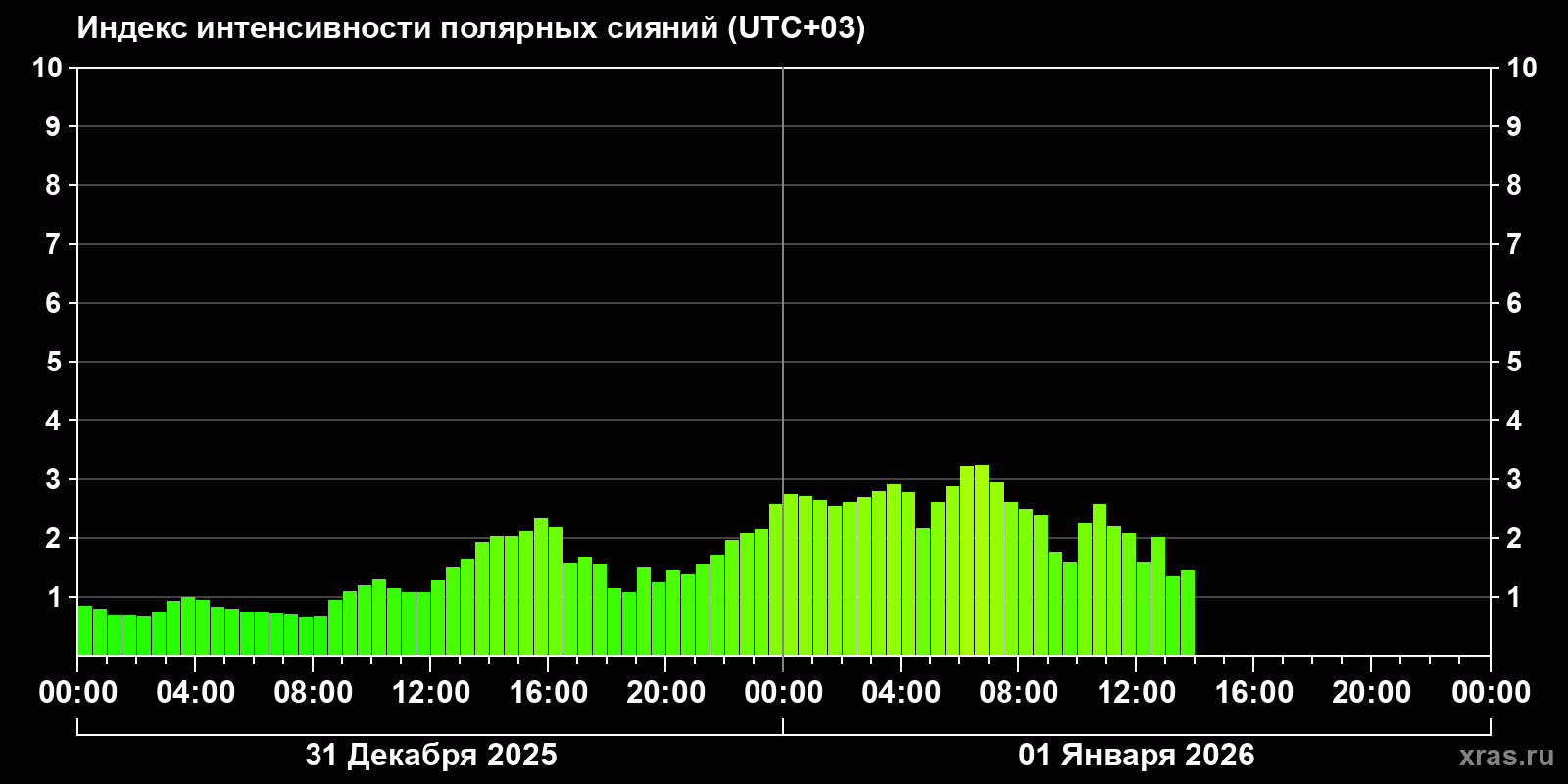 Изменения индекса интенсивности полярных сияний с 2025-12-31 по 2026-01-01 по местному времени