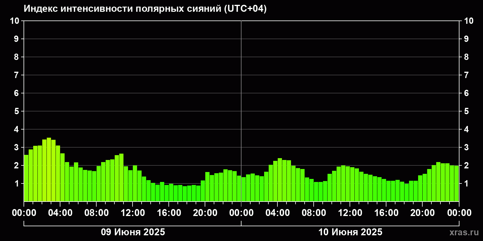 Изменения индекса интенсивности полярных сияний с 2025-06-09 по 2025-06-10 по местному времени
