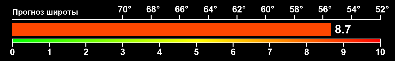 Индекс интенсивности полярных сияний и теоретически возможная широта наблюдений для ночного времени в восточном полушарии по состоянию на 2025-12-12 23:53 (конец дня) по местному времени