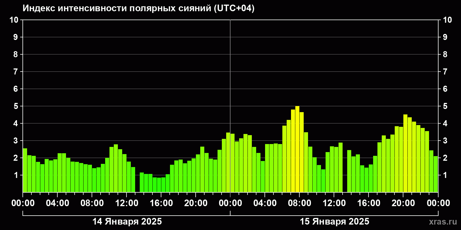 Изменения индекса интенсивности полярных сияний с 2025-01-14 по 2025-01-15 по местному времени