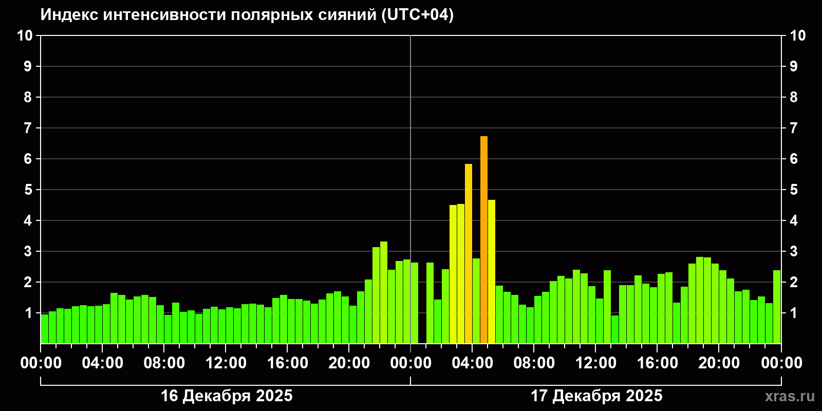 Изменения индекса интенсивности полярных сияний с 2025-12-16 по 2025-12-17 по местному времени