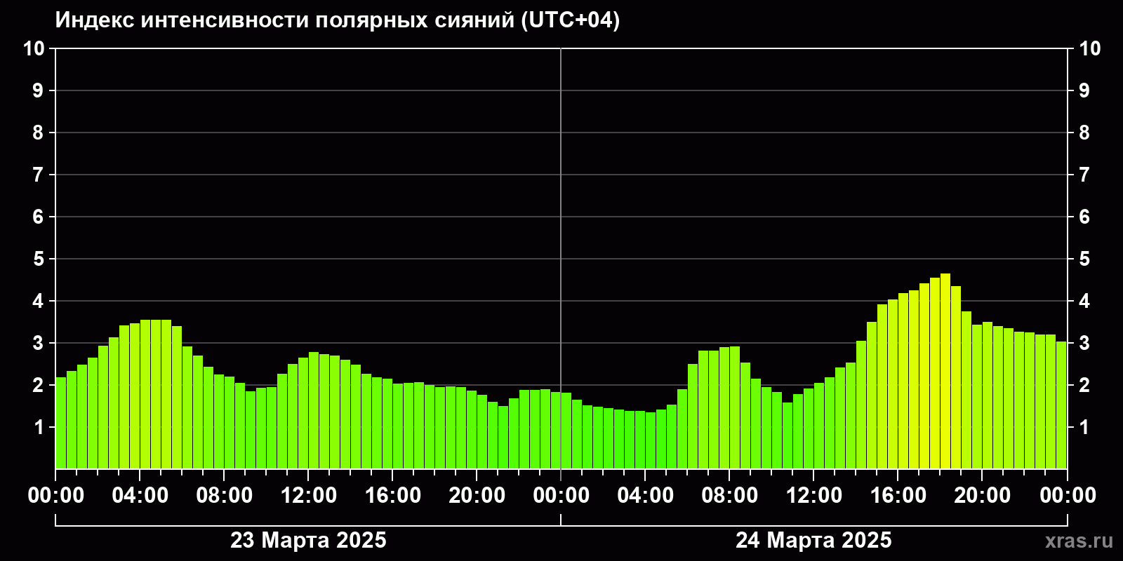 Изменения индекса интенсивности полярных сияний с 2025-03-23 по 2025-03-24 по местному времени