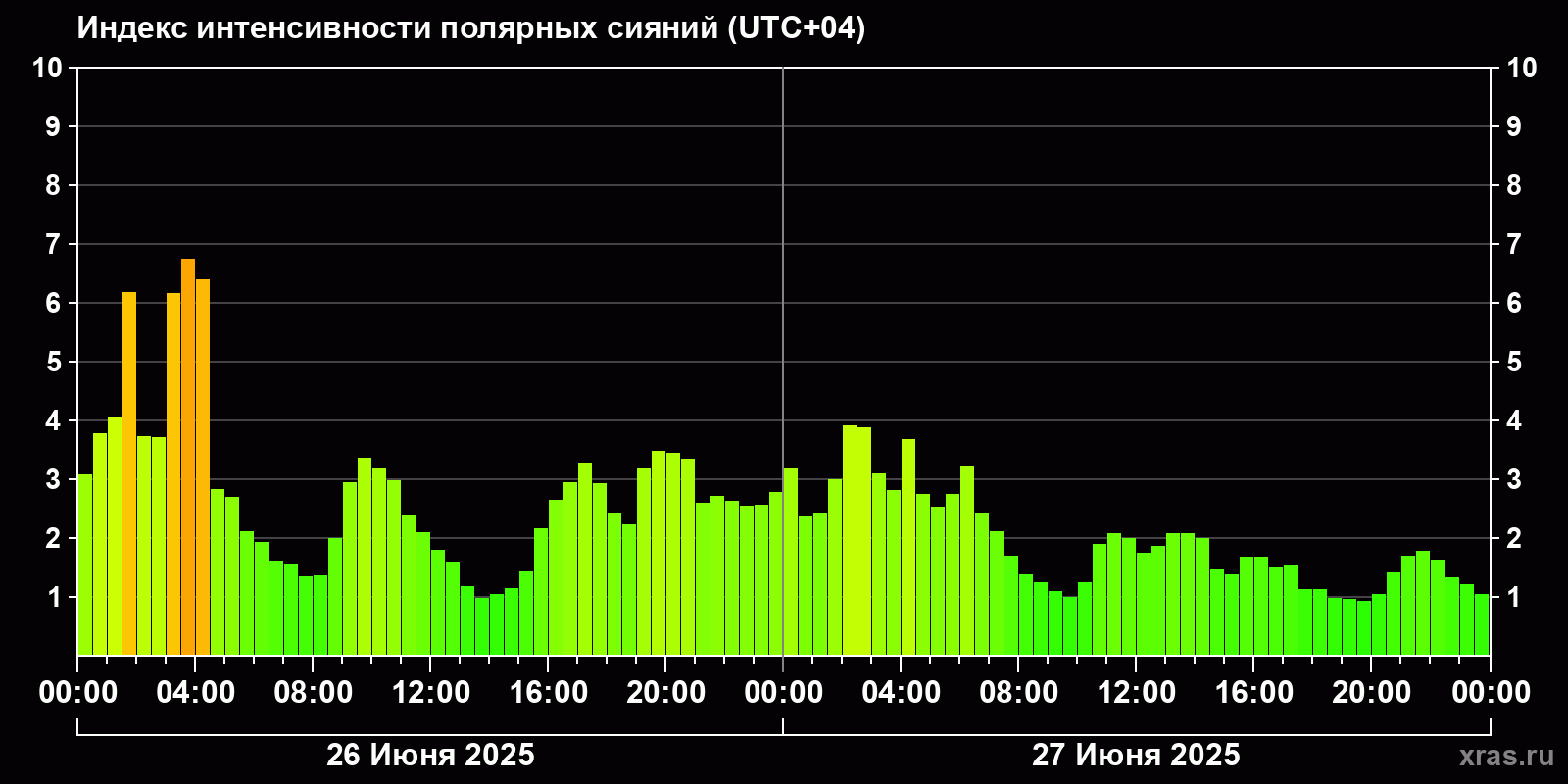 Изменения индекса интенсивности полярных сияний с 2025-06-26 по 2025-06-27 по местному времени