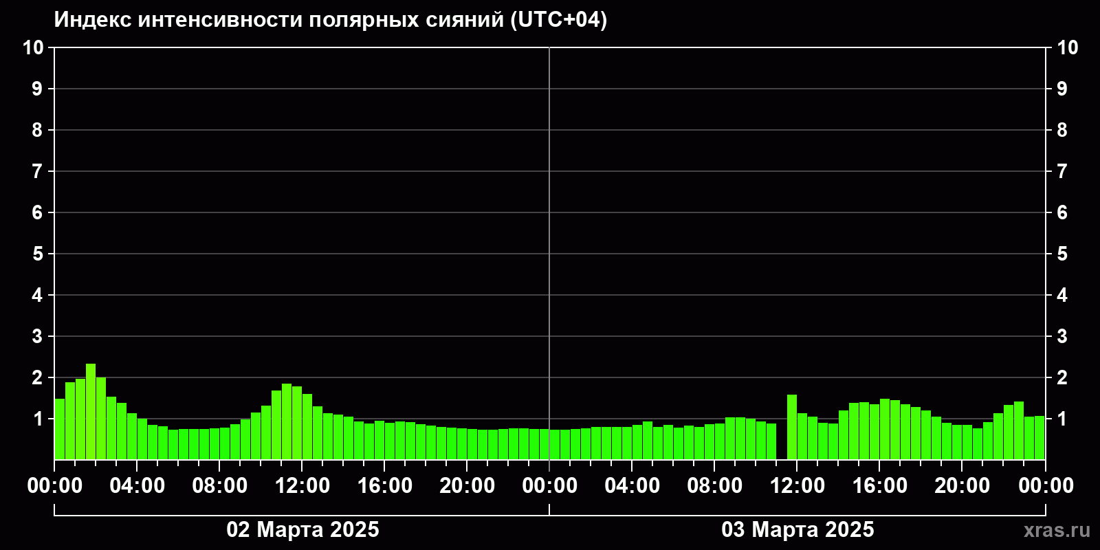 Изменения индекса интенсивности полярных сияний с 2025-03-02 по 2025-03-03 по местному времени
