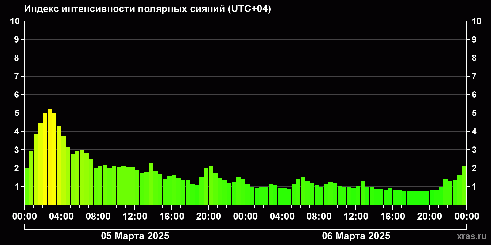Изменения индекса интенсивности полярных сияний с 2025-03-05 по 2025-03-06 по местному времени