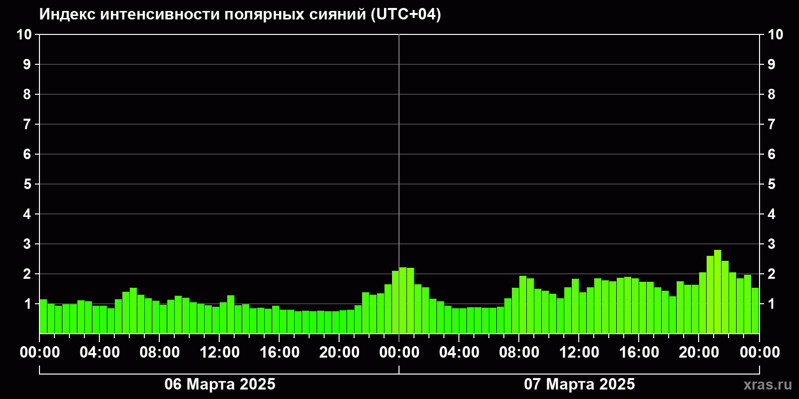 Изменения индекса интенсивности полярных сияний с 2025-03-06 по 2025-03-07 по местному времени