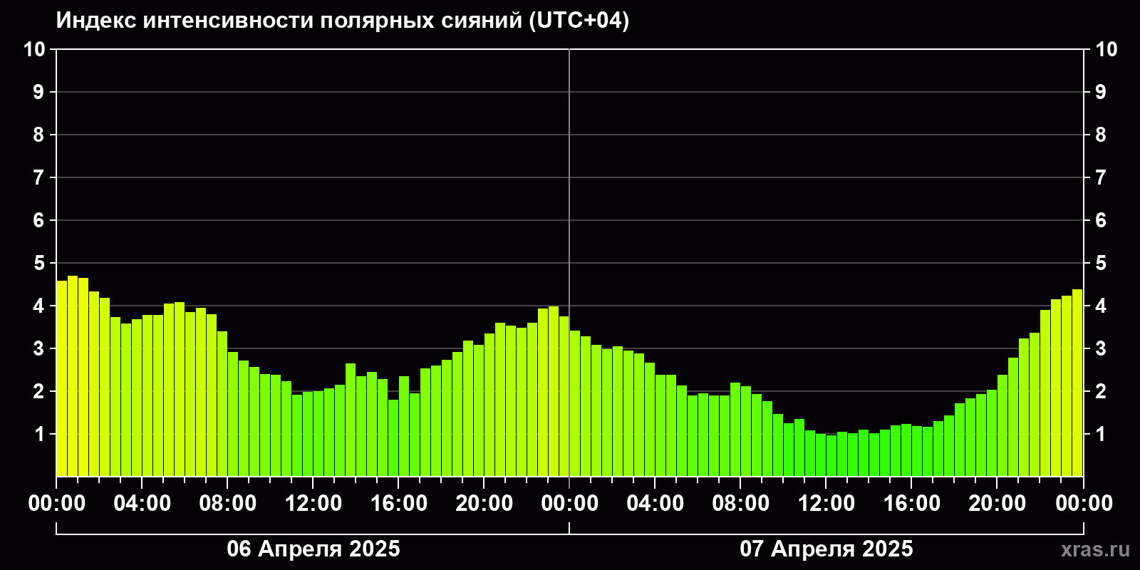 Изменения индекса интенсивности полярных сияний с 2025-04-06 по 2025-04-07 по местному времени