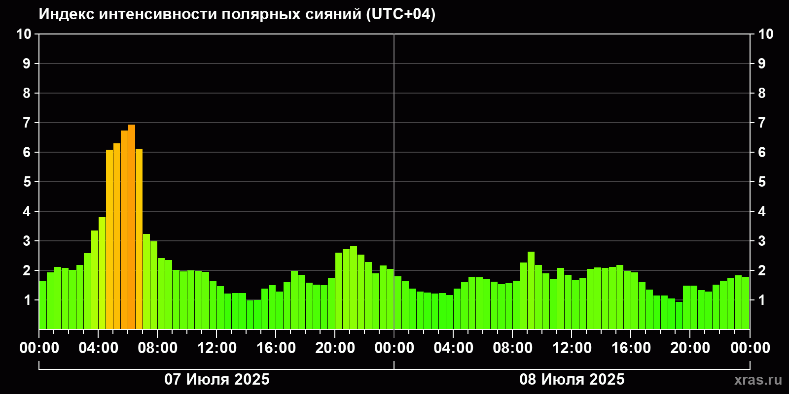 Изменения индекса интенсивности полярных сияний с 2025-07-07 по 2025-07-08 по местному времени