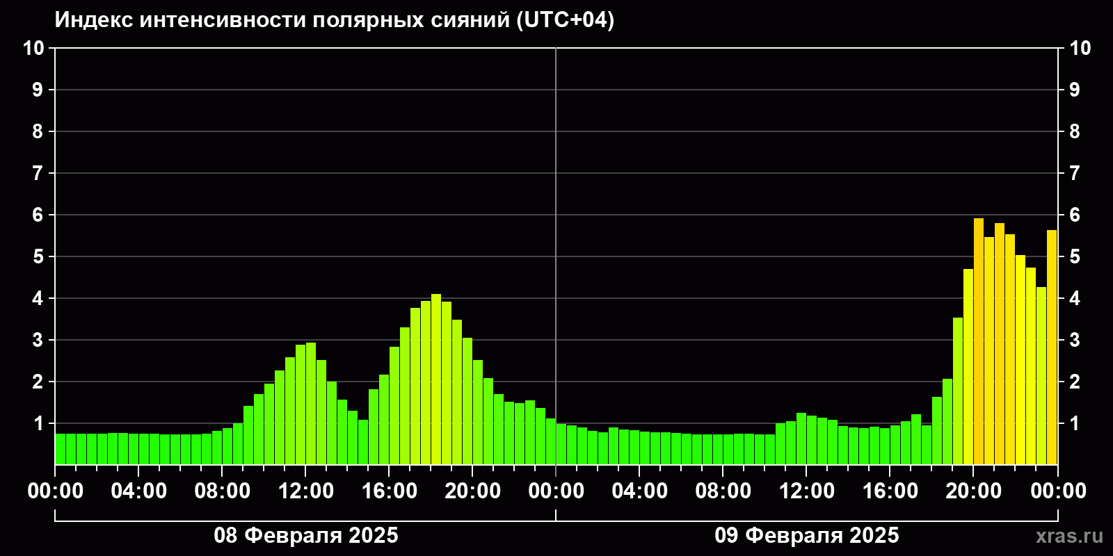 Изменения индекса интенсивности полярных сияний с 2025-02-08 по 2025-02-09 по местному времени