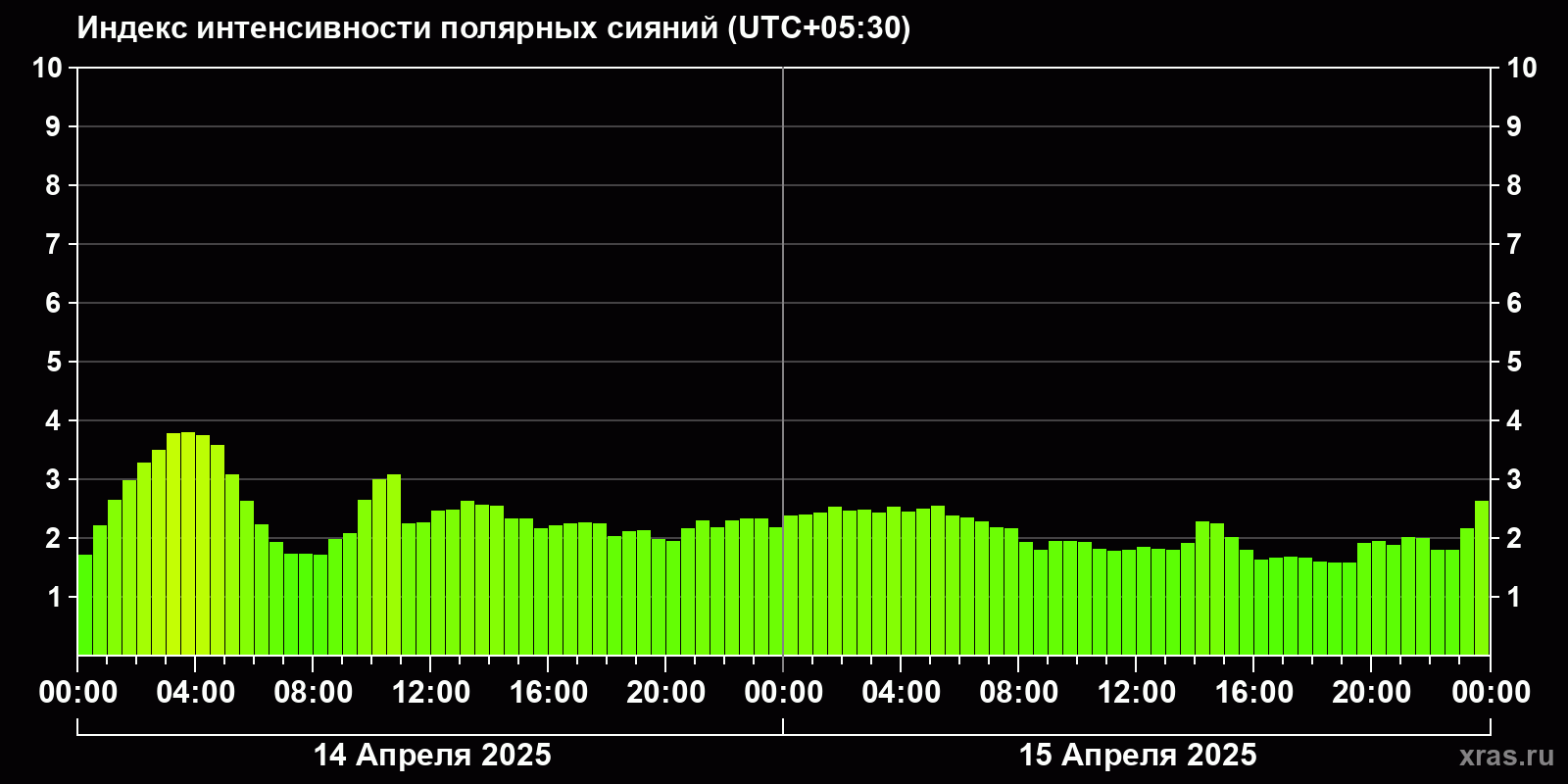 Изменения индекса интенсивности полярных сияний с 2025-04-14 по 2025-04-15 по местному времени