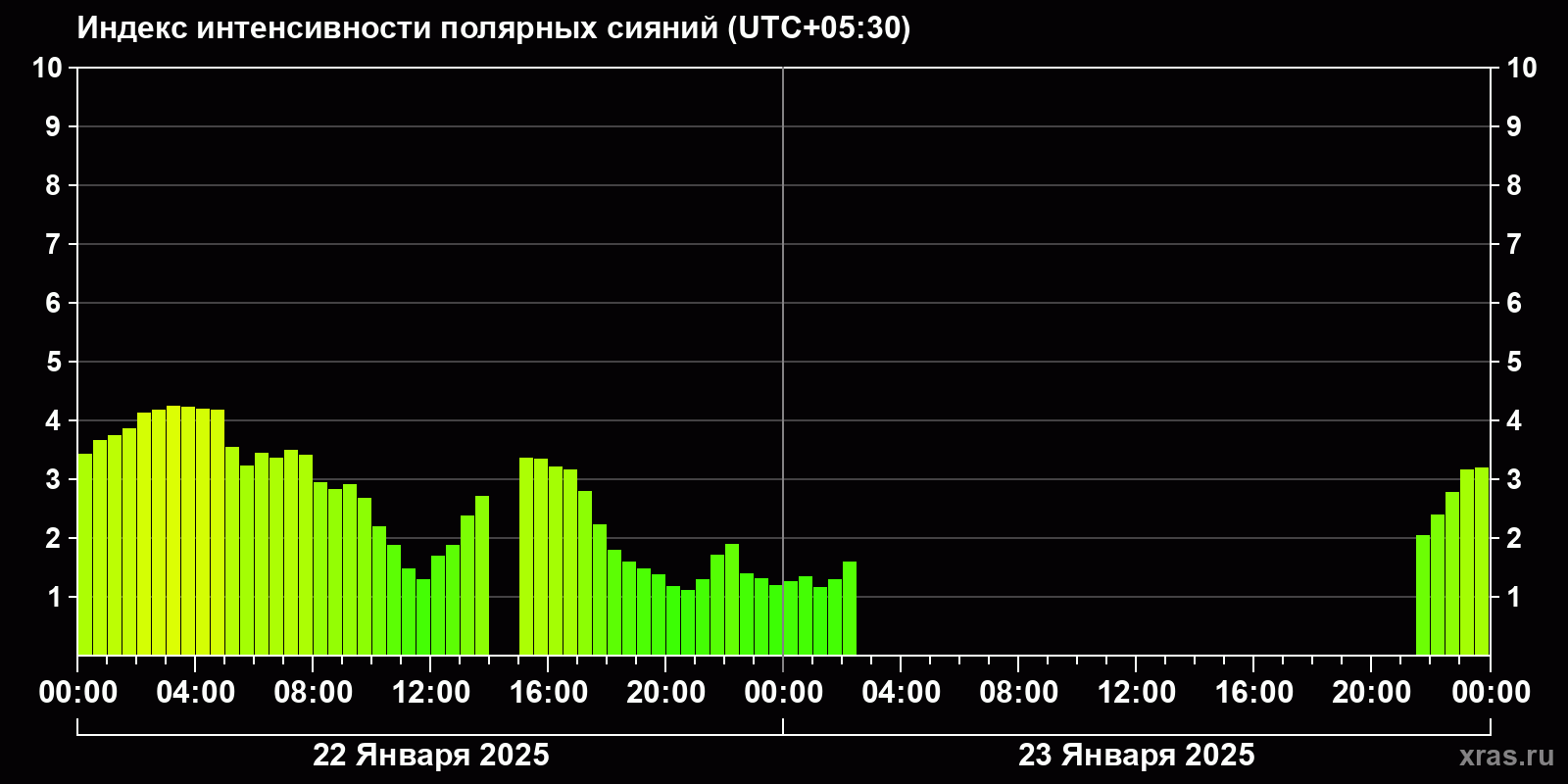 Изменения индекса интенсивности полярных сияний с 2025-01-22 по 2025-01-23 по местному времени