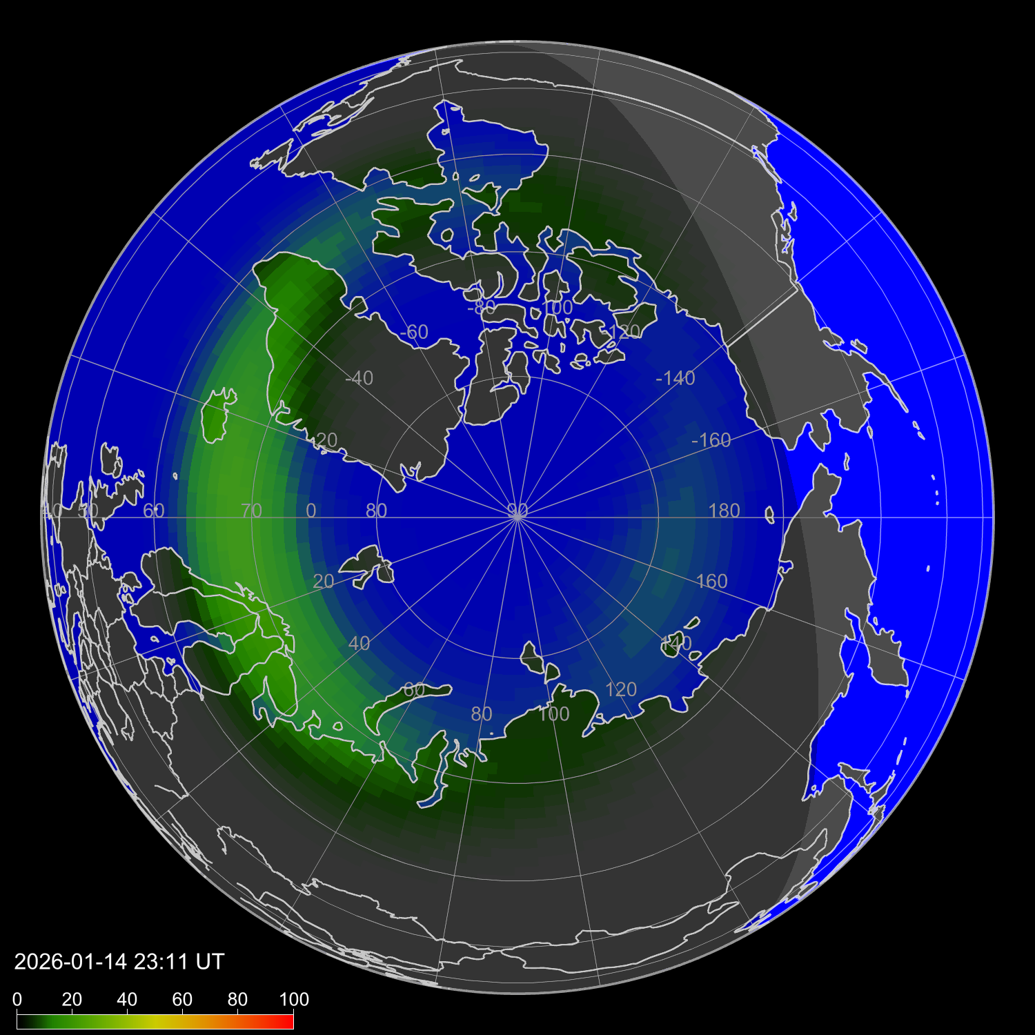 Изменения и часовой прогноз индекса интенсивности полярных сияний с 2026-01-13 по 2026-01-14
