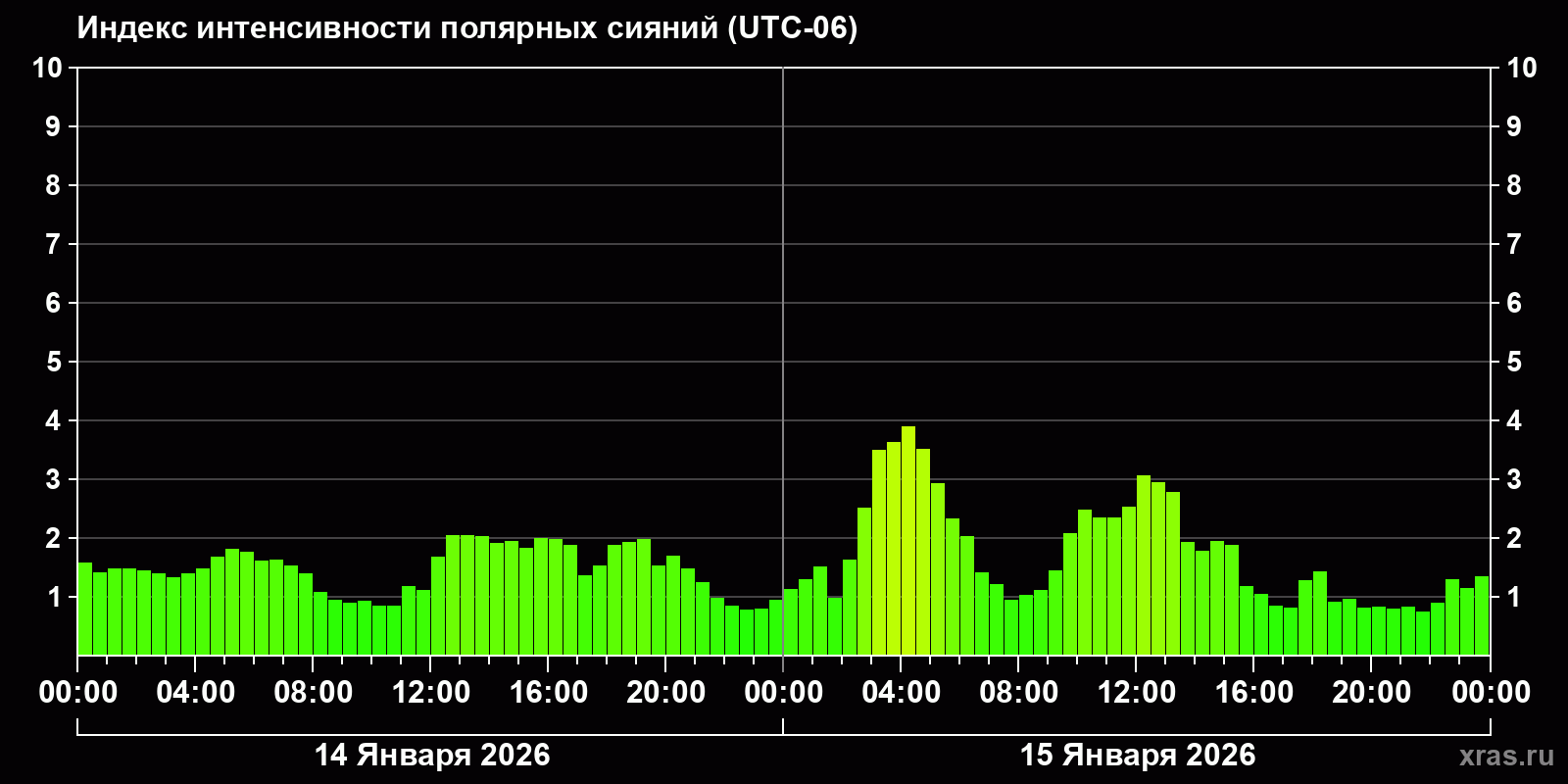 Изменения индекса интенсивности полярных сияний с 2026-01-14 по 2026-01-15 по местному времени